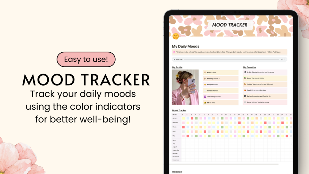 Observe your daily moods using this Mood Tracker and identify the cause of your emotional patterns and triggers.