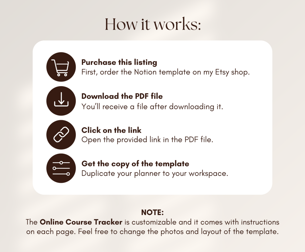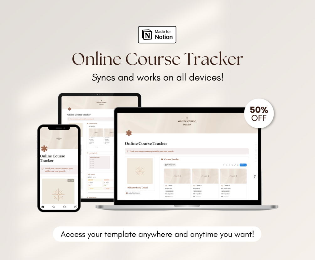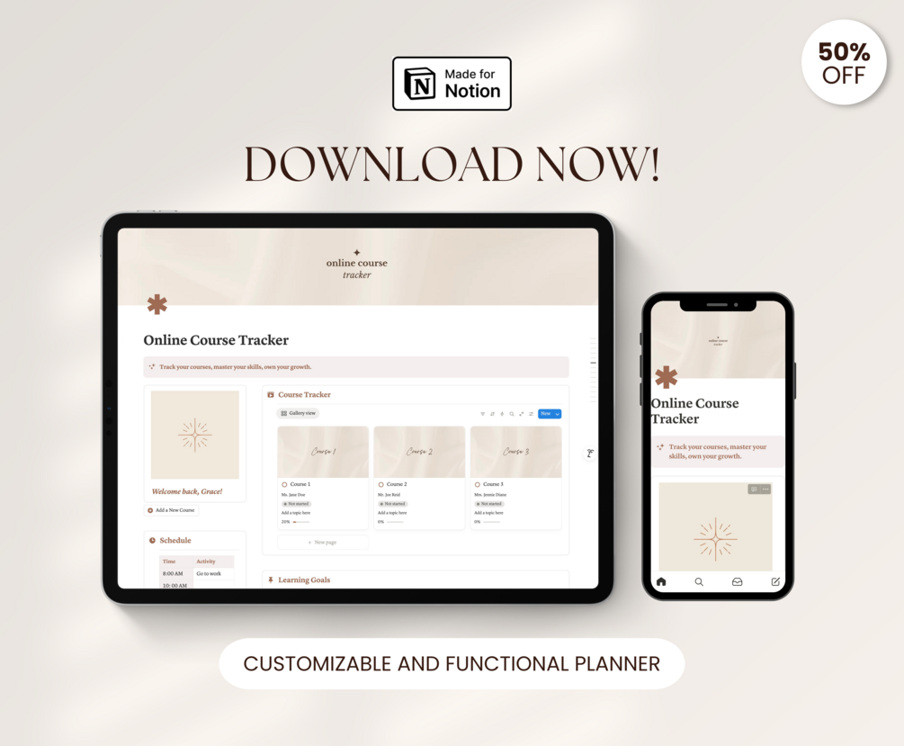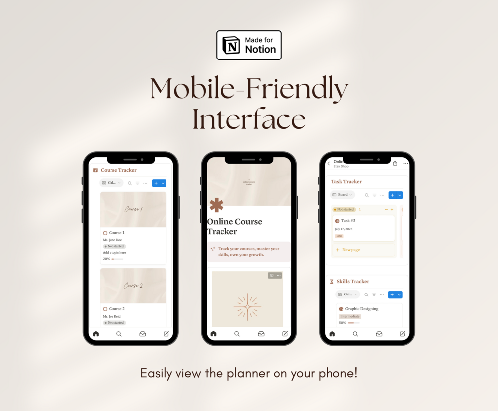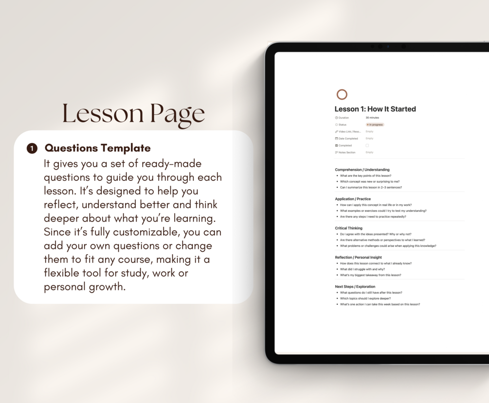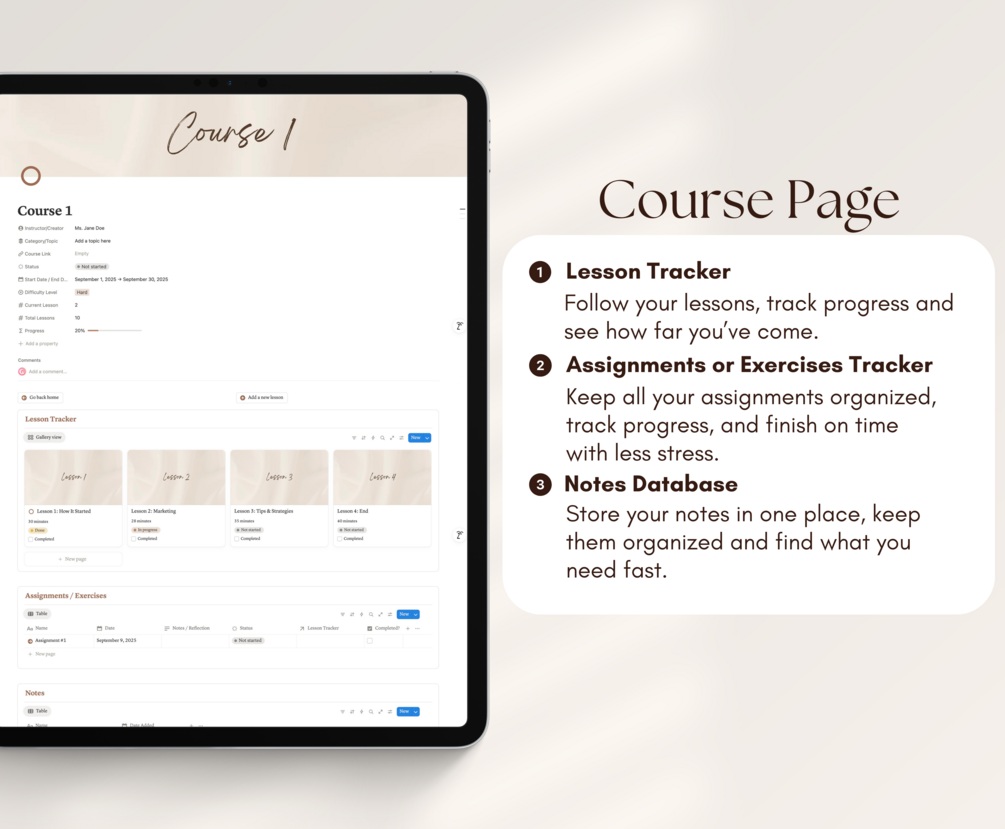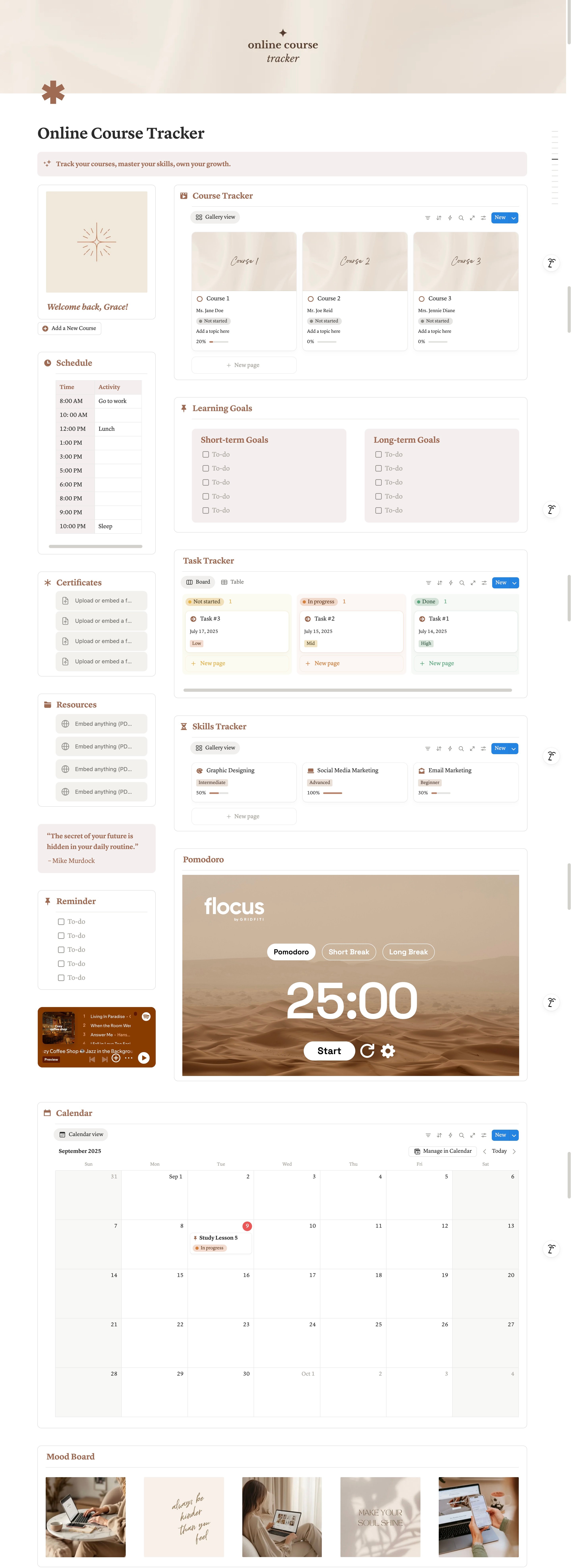 This Notion Template Online Course Planner is made to help you stay organized and keep learning simple. With the Learning Tracker and Course Notes Organizer, you can track your progress, save notes and see everything in one place. This Digital Study Planner, Progress Tracker and Online Course Kit makes it easy to focus, stay on track and finish your courses with confidence.
