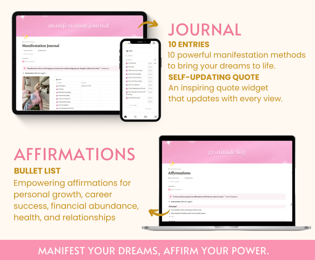 If you’re looking for a manifestation journal, this aesthetic digital journal is the perfect Notion dashboard for daily manifesting and law of attraction journaling. Designed as an ADHD-friendly Notion template, it features a beautiful pink theme that’s both inspiring and easy to use. This dashboard makes journaling simple, helping you stay focused while embracing your manifesting journey. 🌸💫