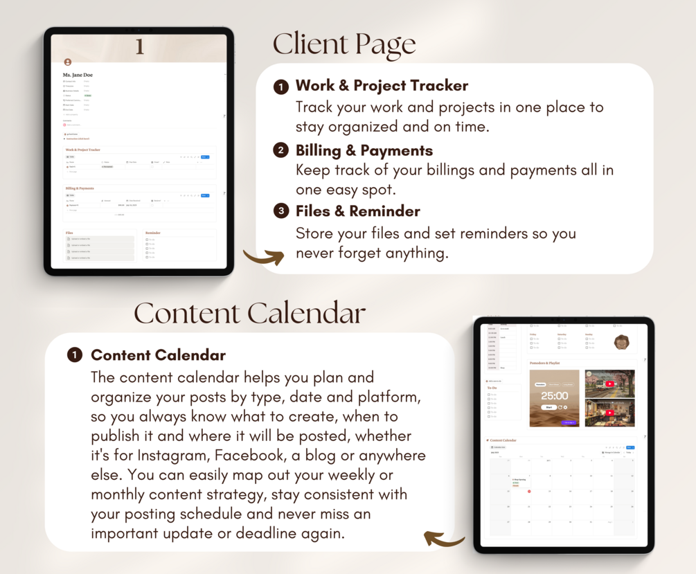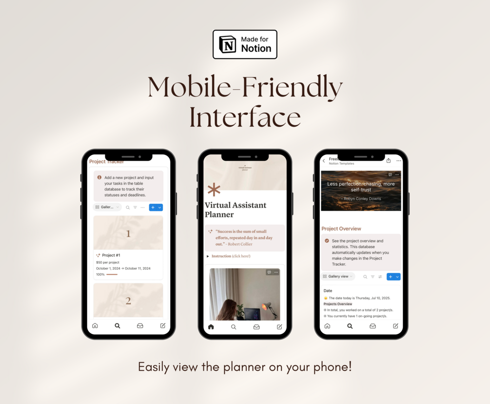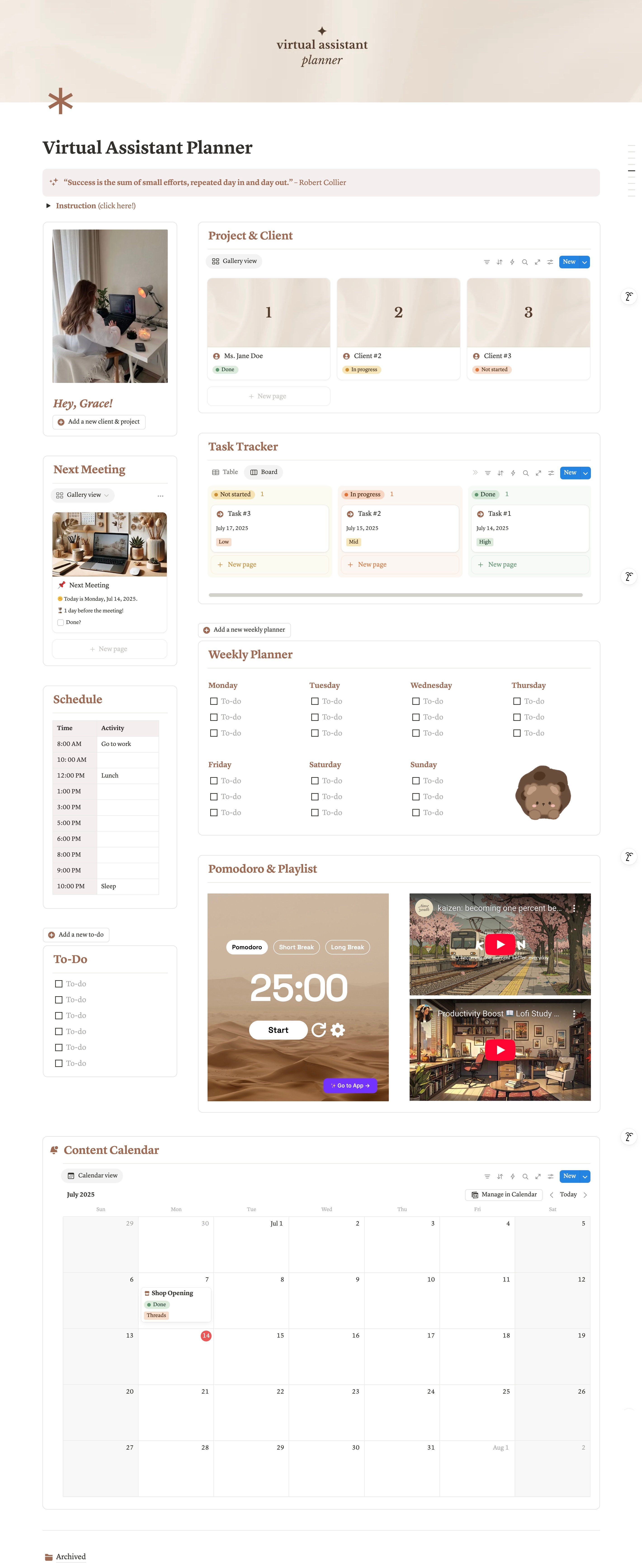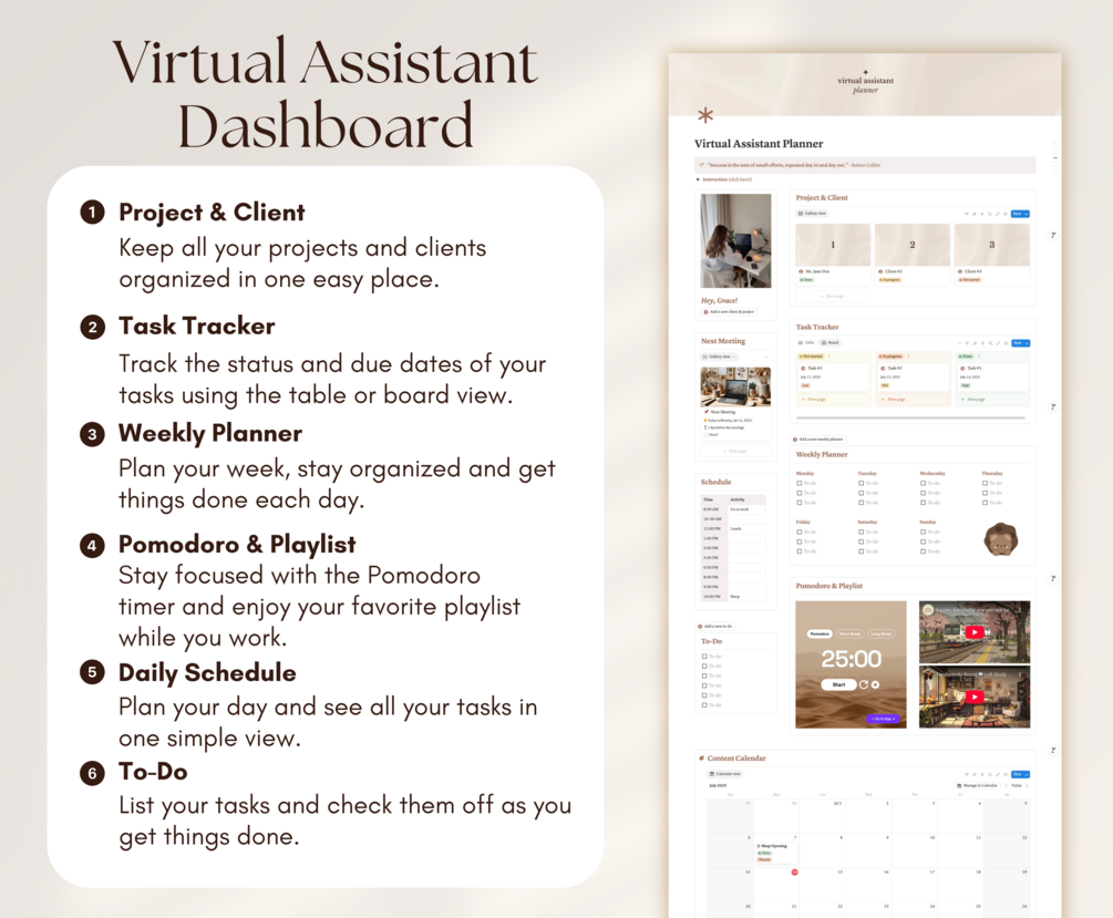 Stay on top of everything with the Virtual Assistant Notion Dashboard Template, ideal for keeping your tasks, clients and projects in one spot. It comes with all the tools you need, like VA Client Management, a Work Planner and a Task Tracker Sheet to help you stay productive and focused. Whether you're freelancing or working from home, this WFH Productivity setup keeps your workflow simple and stress-free.